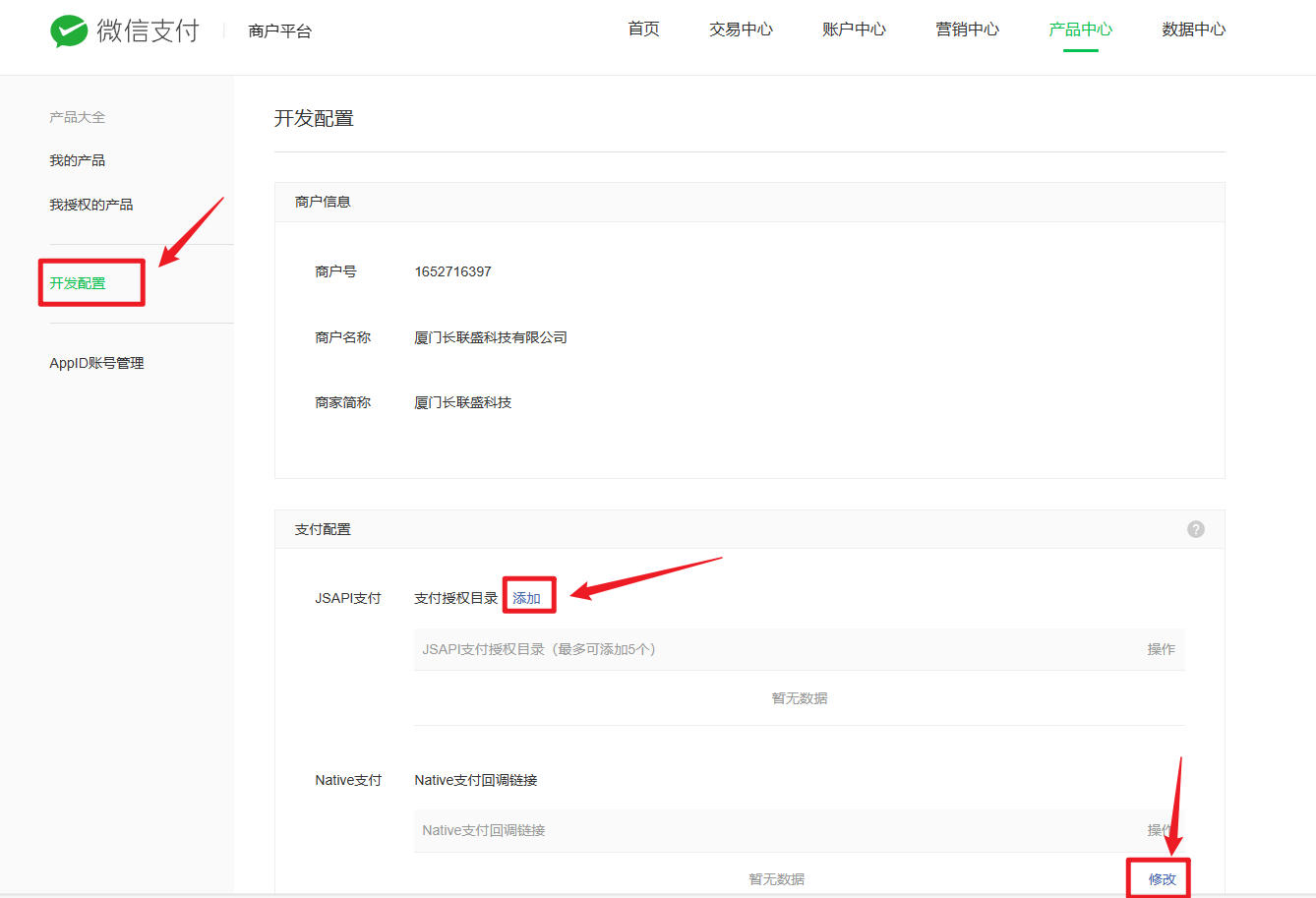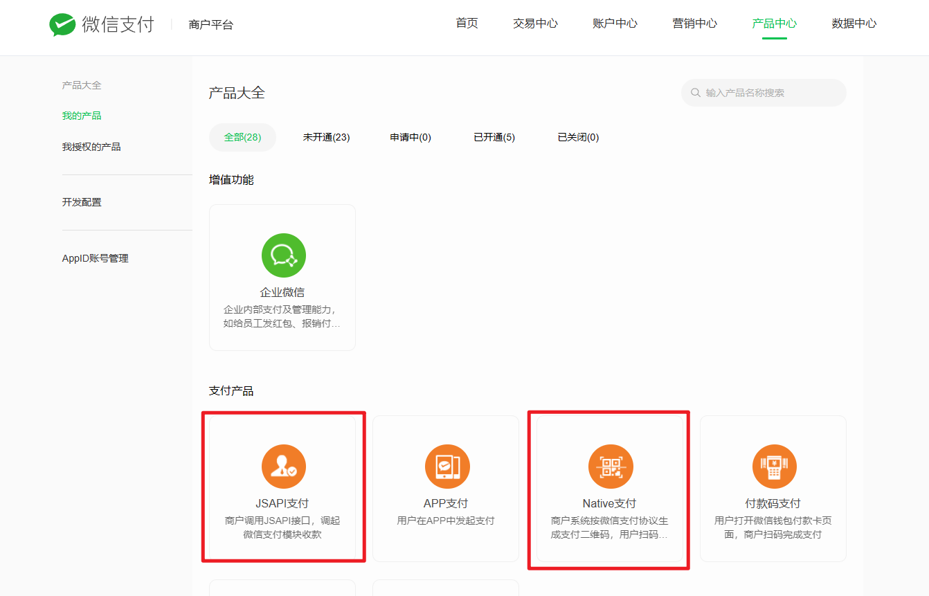 开通JSAPI支付及Native支付两款产品: