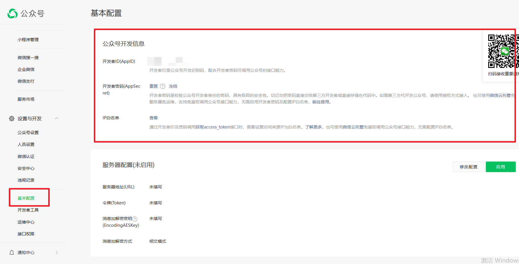 基本配置—公众号开发信息,保存好APPID及秘钥,并设置好白名单: