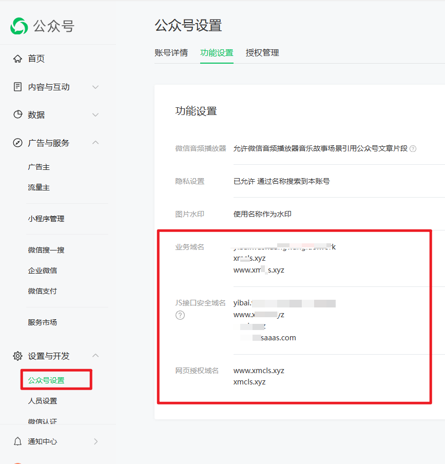 将自己的域名信息分别配置到业务域名、JS安全接口域名及网页授权域名: