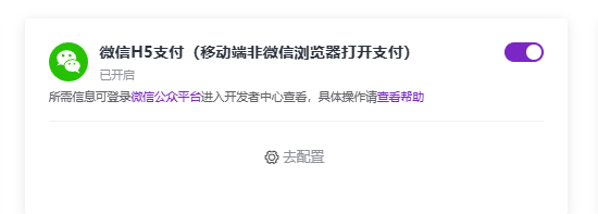 如果需要在浏览器中调用微信支付,请在微信支付后台开启H5支付产品,并在官微中心后台按前面的步骤进行配置: