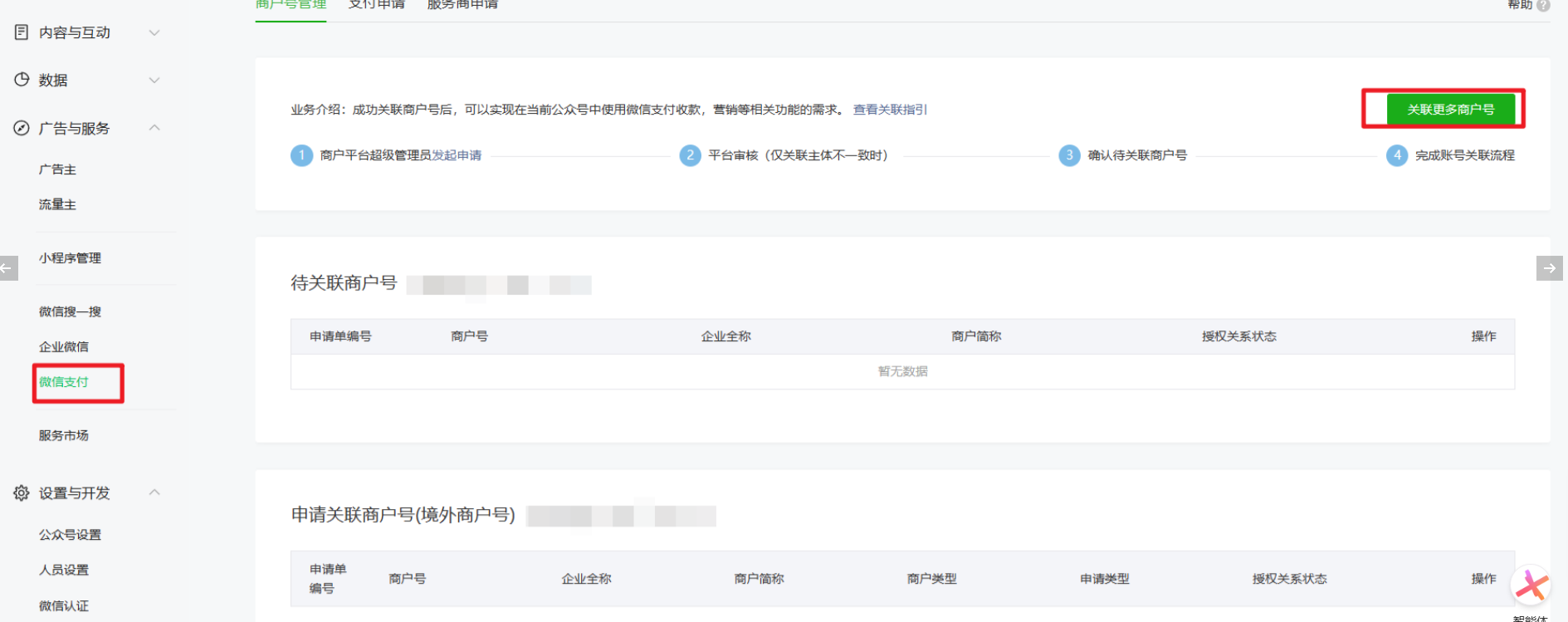 1. 提交授权申请后,返回【微信小程序-微信支付-商户号管理】中进行确认,授权关系状态刷新为正常后,即表示绑定成功。
