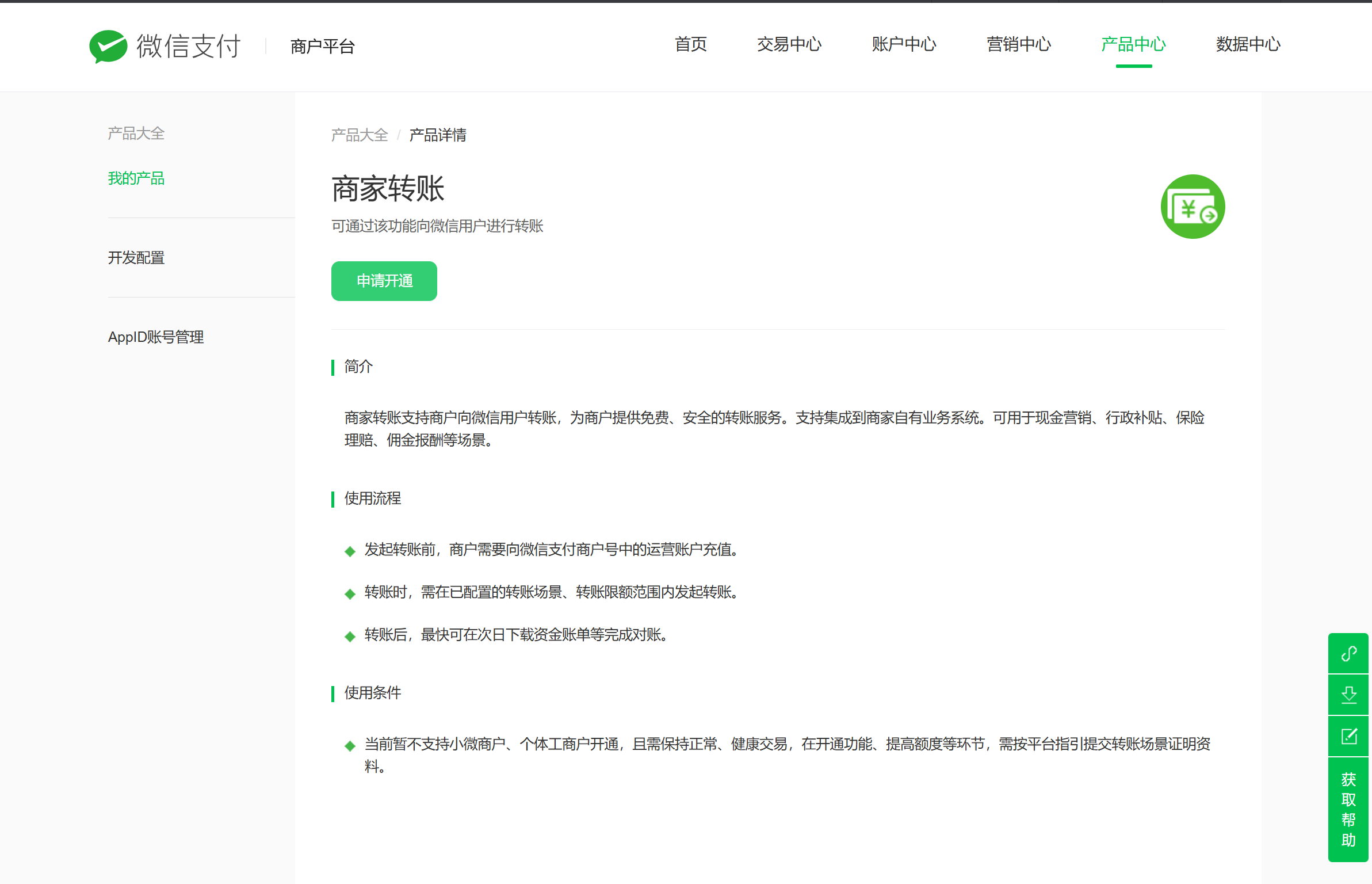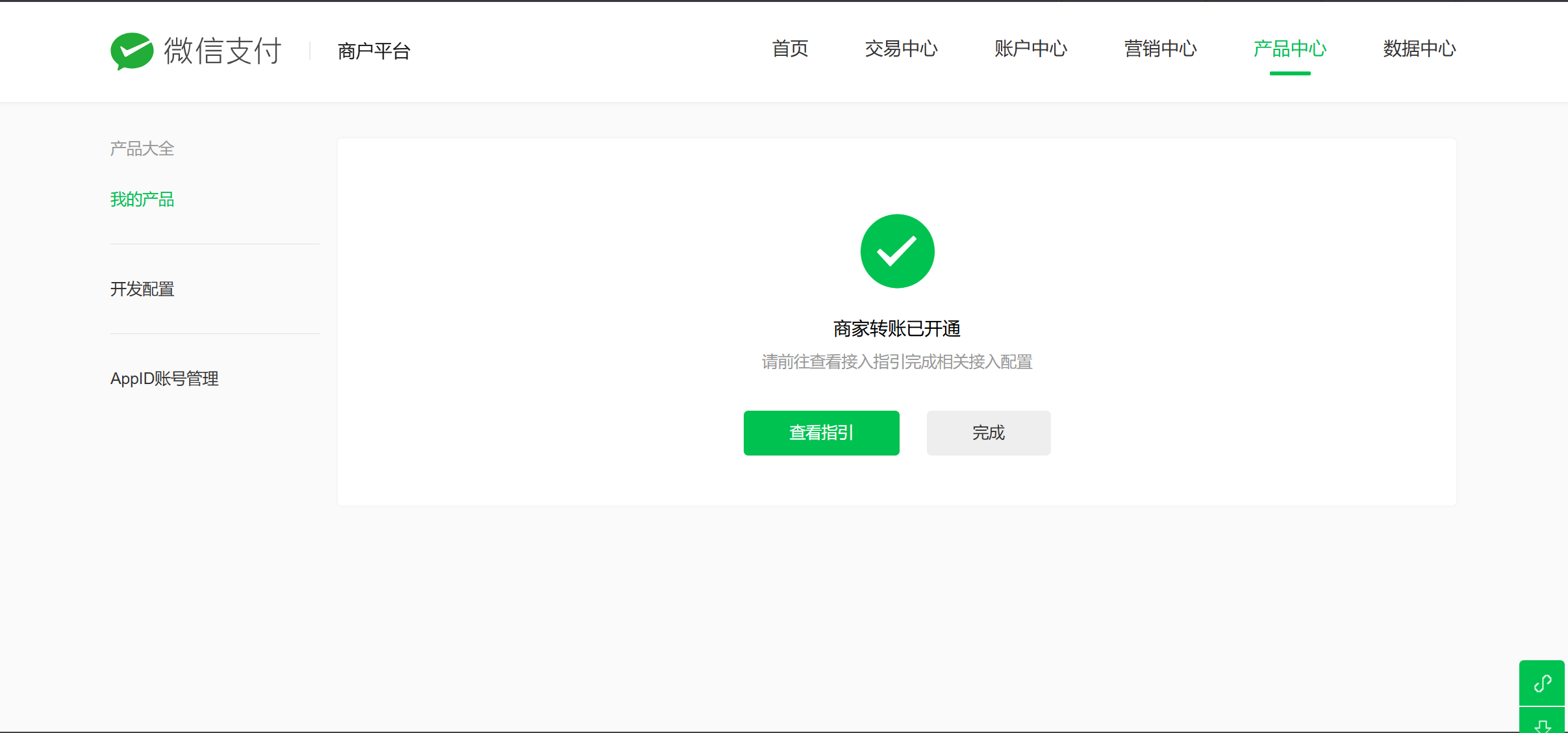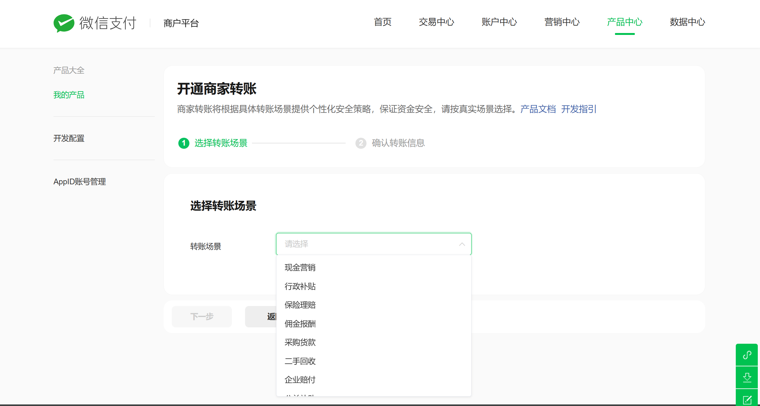 步骤一:登录商户平台,点击“产品中心”
