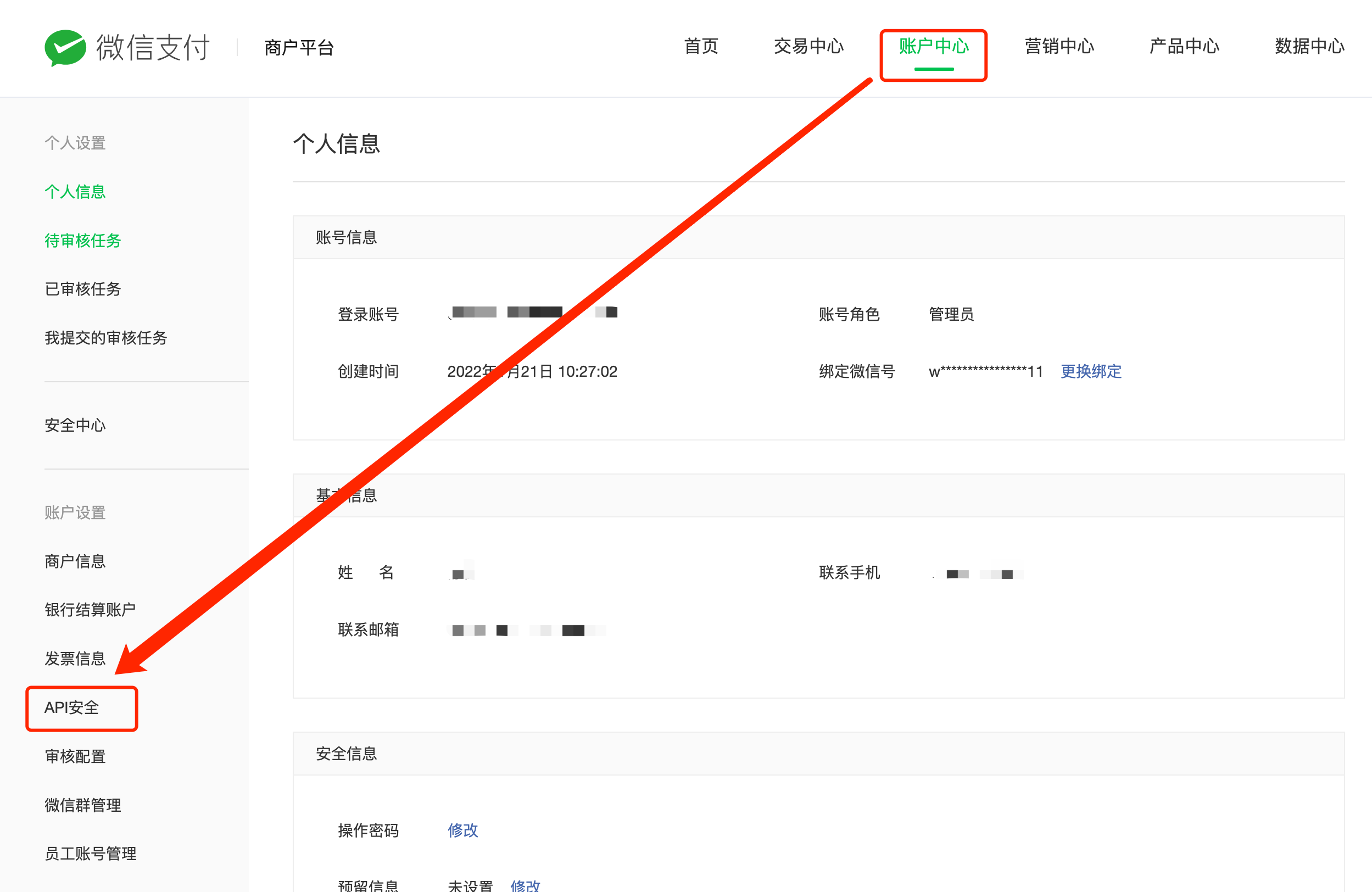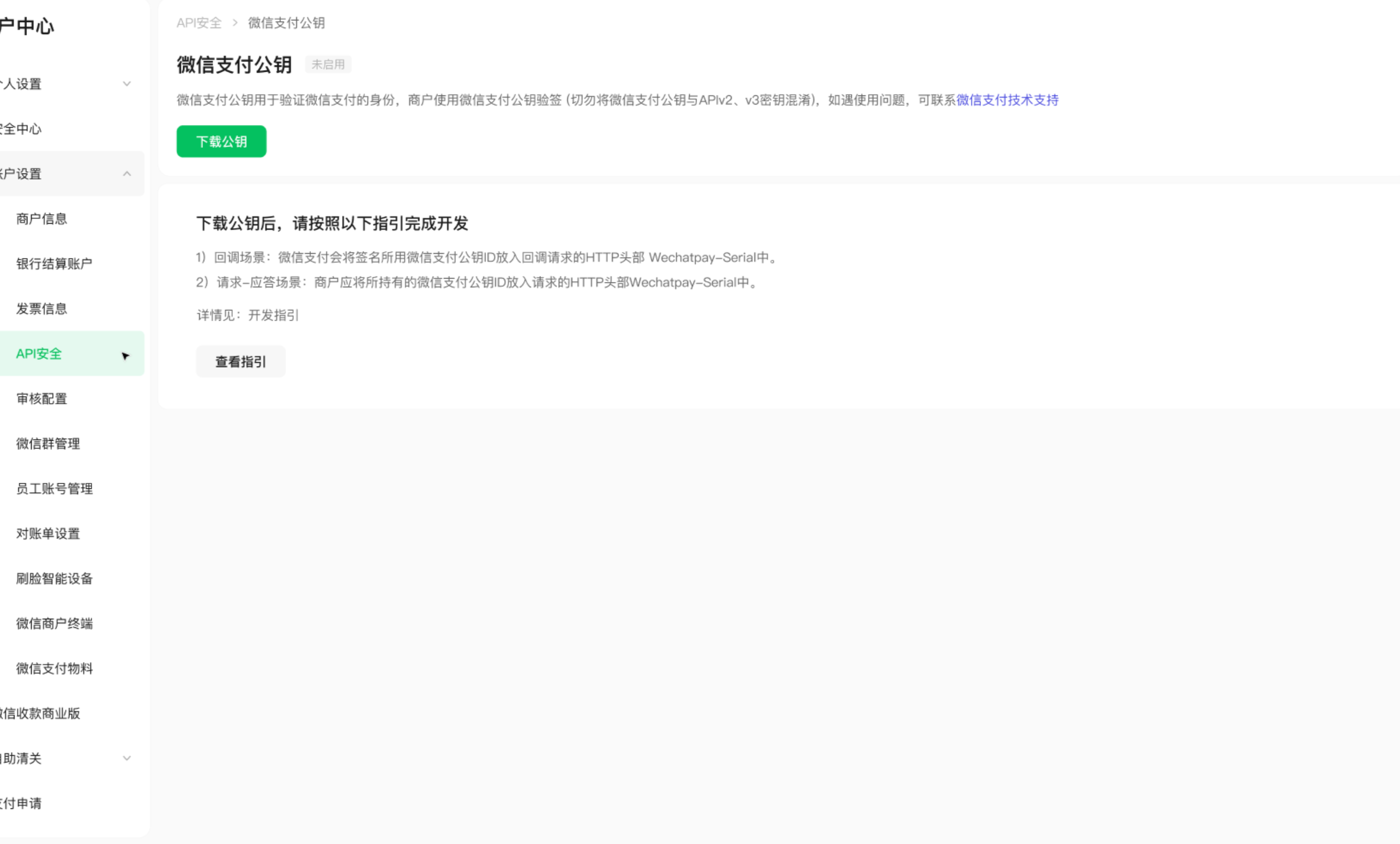 超级管理员或者安全联系人登录商户平台,进入账户中心-API安全页面,点击申请公钥后,可下载微信支付公钥