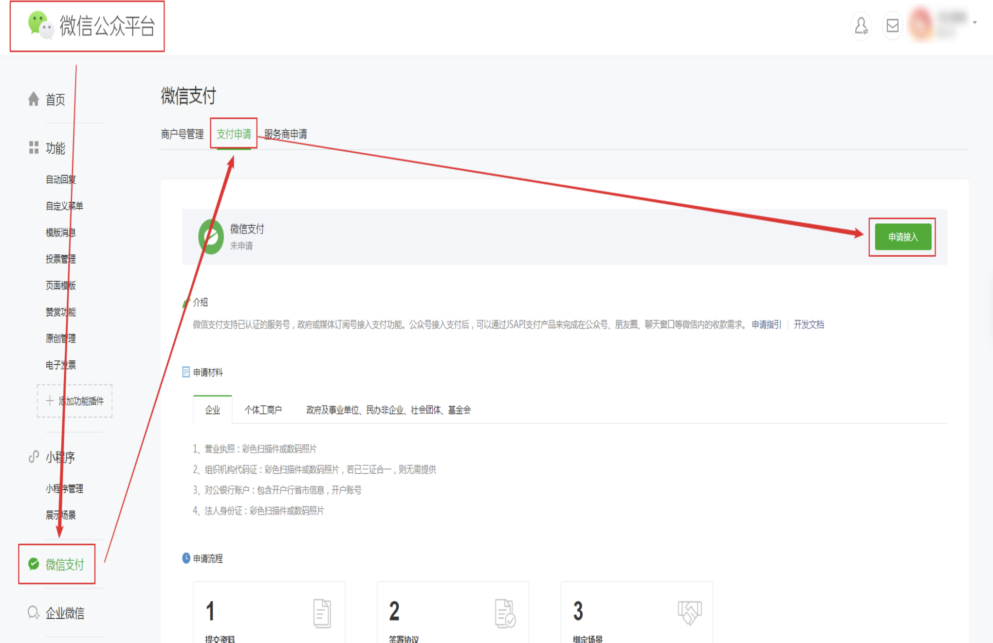 申请微信支付需要提前准备好: 1、微信商户号(注册地址:微信支付 ) 2、认证服务号(用于网站支付,注册地址:微信公众平台 )或小程序(用于商城小程序支付)